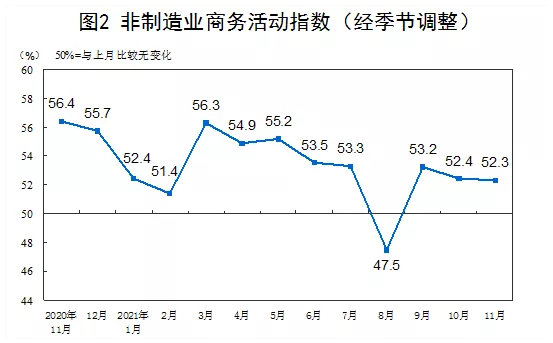 11月份,非制造業(yè)商務(wù)活動(dòng)指數(shù)為52.3%,比10月略降0.1個(gè)百分點(diǎn),繼續(xù)高于臨界點(diǎn),非制造業(yè)總體保持穩(wěn)定恢復(fù)。