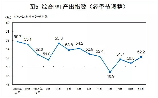 11月份,綜合PMI產(chǎn)出指數(shù)為52.2%,比10月上升1.4個(gè)百分點(diǎn),表明我國(guó)企業(yè)生產(chǎn)經(jīng)營(yíng)活動(dòng)總體擴(kuò)張步伐有所加快。