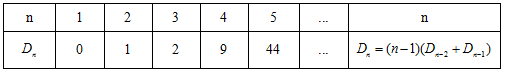 上述題目當(dāng)中相當(dāng)于要把3個元素(信)的位置(信封)重新排列,使得每個元素都不在原來的位置上,這類題目我們稱之為“錯位重排”。當(dāng)元素較少時我們可以通過枚舉法將所有結(jié)果羅列出來。但是當(dāng)元素過多時,情況比較復(fù)雜,再用枚舉法顯然不合適,所以需要我們熟記錯位重排的常用數(shù)據(jù)以及遞推公式。