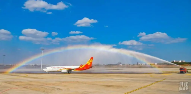 2021年12月2日,??诿捞m國際機場二期正式投運。這是首個抵達機場二期的航班通過水門。