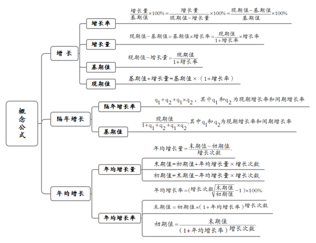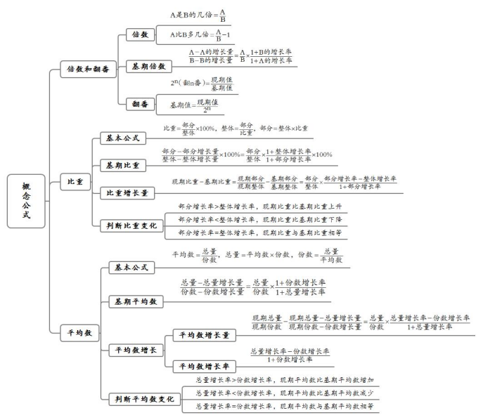 分析歷年省考行測資料分析的題目會發(fā)現(xiàn),考點集中在增長、比重等常規(guī)考點,雖然出現(xiàn)一些特殊概念,如接觸率、治愈率等,但理解難度不高,所以資料分析雖然看似材料長、數(shù)據(jù)大、計算復(fù)雜,但是考點穩(wěn)定,所以同學(xué)們只要掌握好基本的公式和計算方法,多練多算,速度能快速得到提升,下面為同學(xué)們整理了常見的考點公式。