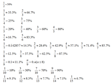 在資料分析的材料中我們可以看到很多百分?jǐn)?shù),在解答與材料相關(guān)的題目時,基本上都會用到百分?jǐn)?shù)。原則上來說,很多百分?jǐn)?shù)都可以轉(zhuǎn)化為特征的分?jǐn)?shù),如果在實(shí)際考試中能夠把一些百分?jǐn)?shù)轉(zhuǎn)化為與之接近的特征分?jǐn)?shù),那將大大的簡化運(yùn)算,減少計(jì)算量。今天我們就一起來看看一些常見的分?jǐn)?shù)如何進(jìn)行轉(zhuǎn)化。
