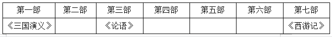 根據(jù)題干條件可以發(fā)現(xiàn)關(guān)于《道德經(jīng)》描述信息次數(shù)最多,可從道德經(jīng)入手,由(1)可知《三國演義》與《道德經(jīng)》之間還有另外兩部著作,因此第四部閱讀《道德經(jīng)》。再由《三國演義》和《道德經(jīng)》之間的著作不是《詩經(jīng)》,并結(jié)合條件(4)可知,第五部閱讀《詩經(jīng)》。而《水滸傳》和《紅樓夢》無順序信息描述,二者具體位置無法確定。最終表格如下: