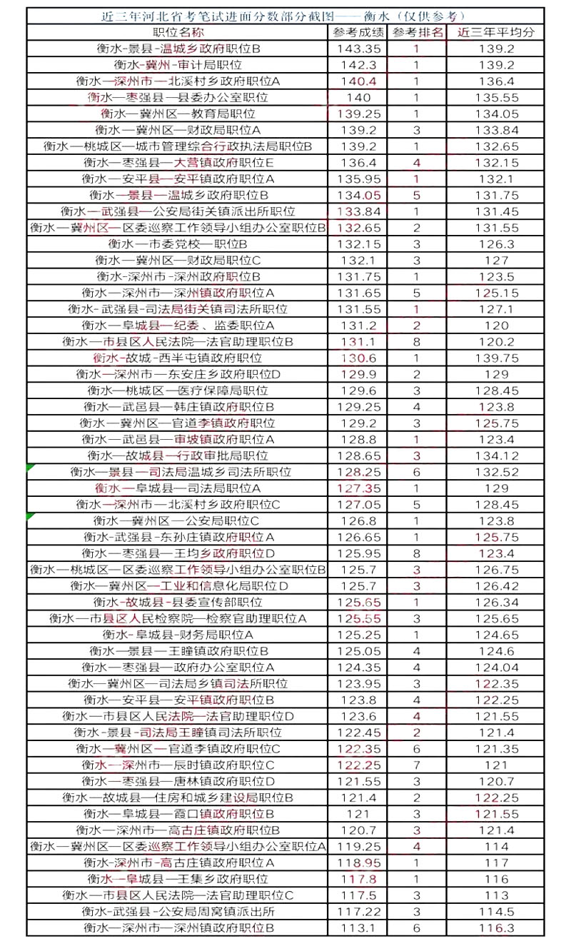 由于 2018 年機構(gòu)改革,河北省公務員招錄情況特殊,只招錄鄉(xiāng)鎮(zhèn)崗位。衡水地區(qū)招錄鄉(xiāng)鎮(zhèn)公務員130人,報名繳費6157人。公考大神云集鄉(xiāng)鎮(zhèn)崗,故 2018 鄉(xiāng)鎮(zhèn)崗位分數(shù)偏高,衡水鄉(xiāng)鎮(zhèn)公務員平均進面分數(shù) 125。