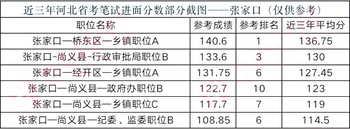 由于2018年機(jī)構(gòu)改革,河北省公務(wù)員招錄情況特殊,只招錄鄉(xiāng)鎮(zhèn)崗位。張家口地區(qū)招錄鄉(xiāng)鎮(zhèn)公務(wù)員 134 人,報(bào)名繳費(fèi) 8922 人。公考大神云集鄉(xiāng)鎮(zhèn)崗,故 2018 鄉(xiāng)鎮(zhèn)崗位分?jǐn)?shù)偏高,張家口鄉(xiāng)鎮(zhèn)公務(wù)員平均進(jìn)面分?jǐn)?shù) 126+。