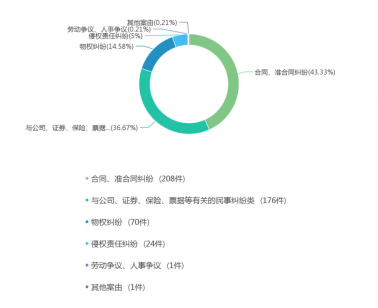 最多的一級案由為合同、準合同糾紛,其下最多的案由為委托理財合同糾紛;第二類是與公司、證券、保險、票據(jù)等有關的民事糾紛類;第三類為物權糾紛,其下案由全部為財產(chǎn)損害賠償糾紛,其本質上屬侵權責任糾紛;此外還有20%左右的案件直接納入侵權責任糾紛。