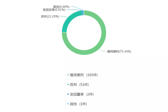 通過對二審裁判結果的可視化分析可以看出,當前條件下維持原判的為165件,占比為75.34%;改判的為51件,占比為23.29%;發(fā)回重審的為2件,占比為0.91%。