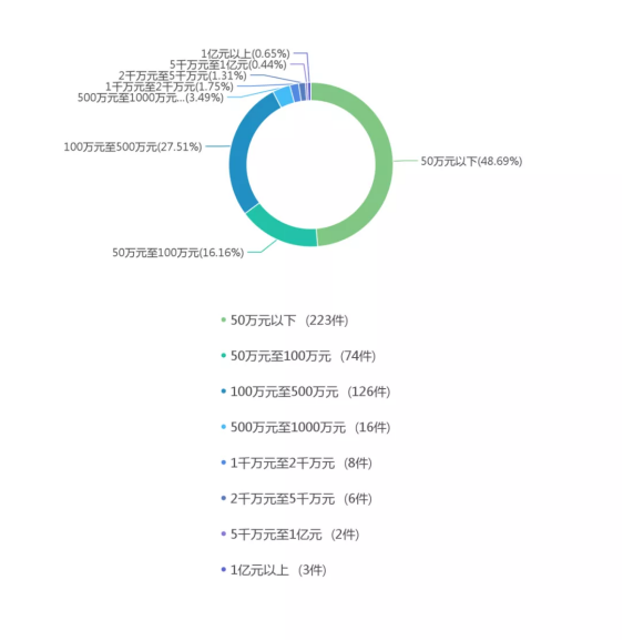 標的額為50萬元以下的案件數(shù)量最多,為223件,占案件總量的48.69%,接近于一半。100萬元至500萬元的案件為126件,占案件總量的27.51%,50萬元至100萬元的案件為74件,500萬元至1000萬元的案件為16件,1千萬元至2千萬元的案件為8件。