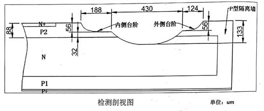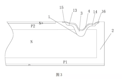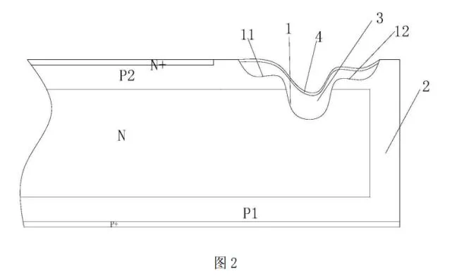 專利權(quán)利要求1記載:1.一種晶閘管芯片的結(jié)終端結(jié)構(gòu),包括長基區(qū)N,短基區(qū)P1、P2,隔離墻,擴磷區(qū)N+,濃硼擴散區(qū)P+,電壓槽,所述的電壓槽成環(huán)形結(jié)構(gòu);其特征在于:所述的電壓槽是耐高壓、表面電場弱的電壓槽結(jié)構(gòu);所述電壓槽兩側(cè)壁的上沿均設(shè)置有臺階結(jié)構(gòu);所述電壓槽側(cè)壁的上沿設(shè)置有二級臺階結(jié)構(gòu)。