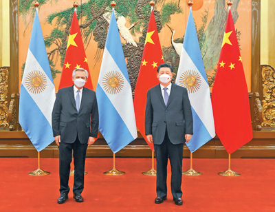 習(xí)近平強(qiáng)調(diào),中方愿同阿方加強(qiáng)高層交往和治國理政經(jīng)驗(yàn)交流,相互支持對方在維護(hù)主權(quán)、安全、發(fā)展利益上的正當(dāng)主張。中方愿同阿方共享發(fā)展機(jī)遇,助力阿根廷擴(kuò)大出口和產(chǎn)業(yè)升級。雙方要高質(zhì)量共建“一帶一路”,充分發(fā)揮互補(bǔ)優(yōu)勢,落實(shí)好水電、鐵路等現(xiàn)有重大項(xiàng)目,深化貿(mào)易、農(nóng)業(yè)、能礦、基礎(chǔ)設(shè)施、投融資、抗疫等領(lǐng)域合作。中阿航天、海洋等合作為人類探索星辰大海作出積極貢獻(xiàn)。雙方要努力打造數(shù)字經(jīng)濟(jì)、綠色發(fā)展等合作新亮點(diǎn)。我愿同你共同宣布啟動(dòng)2022中阿友好合作年,積極開展文化、教育、體育、媒體、青年、地方等領(lǐng)域交流,便利人員往來,促進(jìn)民心相通。