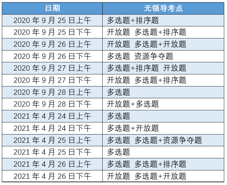 根據(jù)2020年和2021年考察的題目來(lái)看,考察比較多的題型是多選題、開放題。資源爭(zhēng)奪題考察的頻率不高,單獨(dú)考察只出現(xiàn)過一次。排序題常常作為復(fù)合題型的考察點(diǎn)出現(xiàn)在題目中。