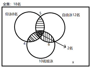 【例題3】18名游泳運動員中,有8名參加仰泳,有10名參加蛙泳,有12名參加自由泳,有4名既參加仰泳又參加蛙泳,有6名既參加蛙泳又參加自由泳,又5名既參加仰泳又參加自由泳,有2名這三個項目都參加。三個項目都沒有參加的有多少名?( )
