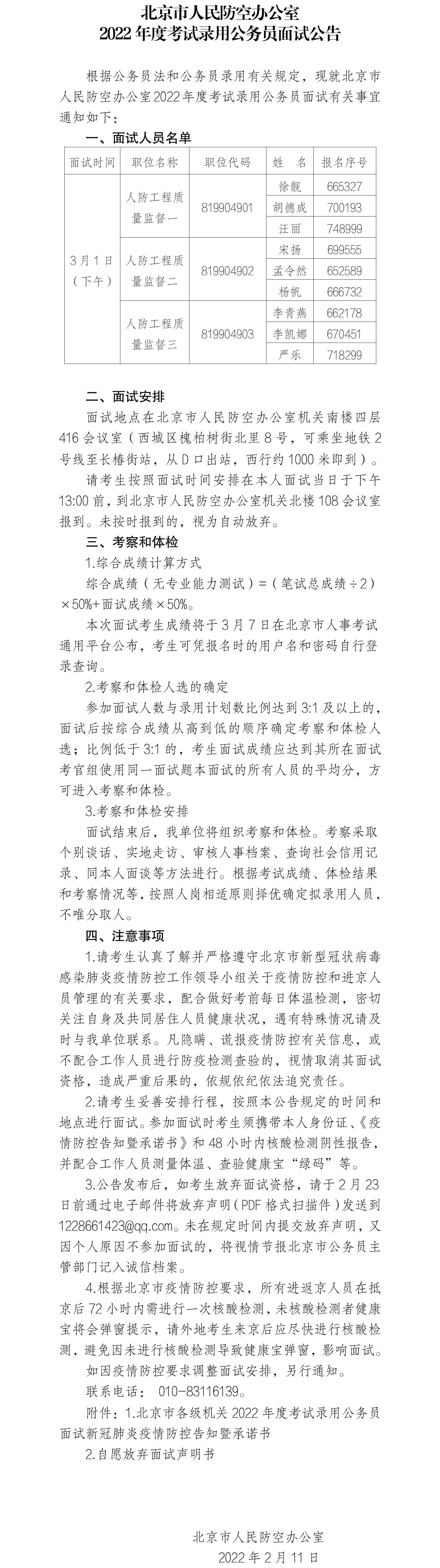 北京市人民防空辦公室 2022年度考試錄用公務(wù)員面試公告
