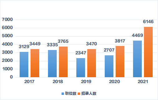 近五年省考招錄人數(shù)整體呈上升趨勢,2021年云南省考公告招錄人數(shù)與2020年相比,由3817人增加至6146人,擴招61%,如果今年仍然有擴招趨勢,無疑增加了廣大考生的錄取幾率。