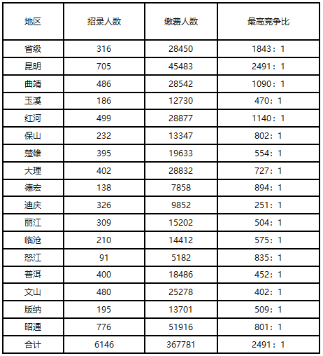 2021年云南省公務(wù)員考試共招錄6146人,設(shè)置4469個職位,報考人數(shù)為367781人,從這些數(shù)據(jù)我們可以知道省考競爭十分激烈。在2021年省考招錄中,招錄人數(shù)最少的地市是怒江,共招錄91人,報名人數(shù)5182人,平均競爭比達到57:1。招錄人數(shù)最多的地市是昭通,共招錄776人,報名人數(shù)51916人,平均競爭比達到67:1。在全省的最高競爭比中,昆明市的最高競爭比高達2491:1,在全省各地市中名列第一??梢姡还茉谀膫€地市,省考崗位都是炙手可熱的,千萬不能掉以輕心。