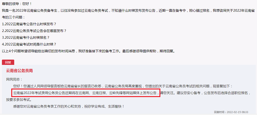 官方回復(fù)中說明:云南省2022年考試錄用公務(wù)員公告近期將在云南網(wǎng)、云南日報(bào)、云嶺先鋒等網(wǎng)站媒體上發(fā)布公告。