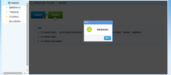 考生填寫個人的報(bào)考信息后,點(diǎn)擊“保存”按鈕后,提示保存成功,可跳轉(zhuǎn)到報(bào)考流程頁面,如下圖所示: