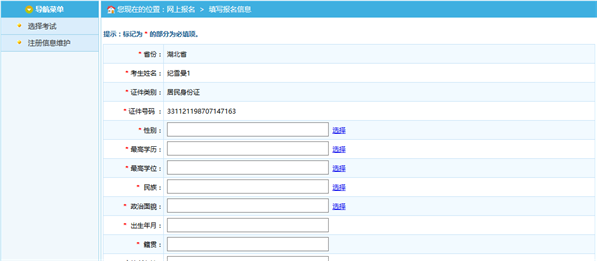 通過點(diǎn)擊接受按鈕,進(jìn)入考生填寫報(bào)名信息的頁面,如下圖所示: