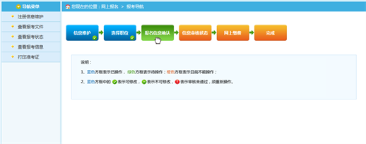 通過點(diǎn)擊“確認(rèn)”按鈕,提示確認(rèn)成功后跳轉(zhuǎn)到報(bào)考流程頁面。進(jìn)入審核狀態(tài),等待管理員進(jìn)行資格審核。