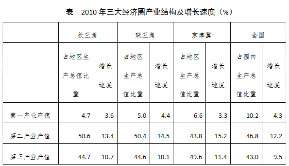 三大經(jīng)濟(jì)圈中,2010年三次產(chǎn)業(yè)增長(zhǎng)速度均超過(guò)全國(guó)平均水平的有幾個(gè)?
