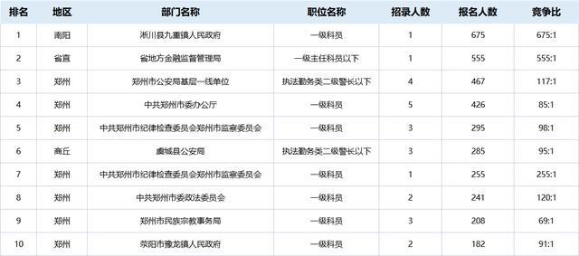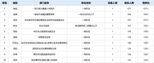 另外,根據(jù)首日報名情況,報名人數(shù)較多的十大崗位也已出爐。大部分為省直和鄭州地區(qū)崗位: