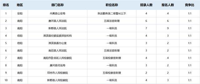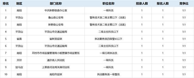 值得關注的是,目前競爭較低的十大崗位多分布于南陽(如下圖所示),多是一些檢察院和法院,因為報考法院和檢察院系統(tǒng)部分崗位需要取得《法律職業(yè)資格證書》A證,條件的限制,也讓很多考生“拒之門外”。