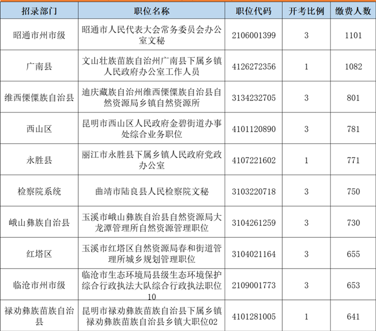 2022云南省考報名繳費前十崗位(截止25日9點)