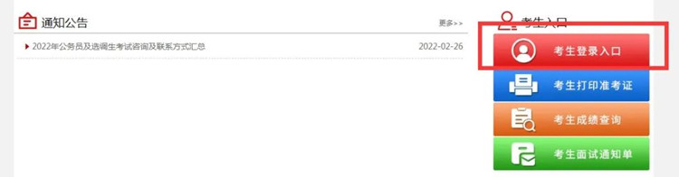 進(jìn)入河北省2022年度公務(wù)員錄用省市縣鄉(xiāng)四級(jí)聯(lián)考暨選拔選調(diào)生考試專題后點(diǎn)擊右側(cè)的考生登錄入口。
