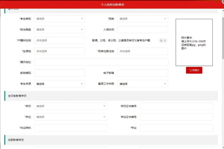 基本信息的填寫。*號(hào)為必填項(xiàng),同時(shí)報(bào)考考生需要注意照片要求:請(qǐng)上傳大小15kb以內(nèi)并且類型是jpg、jpeg的圖片。