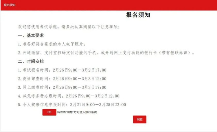 登錄后考生會(huì)看到本次考試的報(bào)名須知,仔細(xì)閱讀須知信息,點(diǎn)擊同意進(jìn)入到報(bào)考界面。