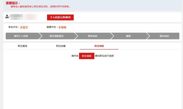 在填報(bào)具體職位信息前,考生需要先完善自己的報(bào)名信息,點(diǎn)擊姓名右側(cè)的個(gè)人信息完善/修改按鈕。注意,報(bào)考的職位審核通過后個(gè)人信息將不能再修改,因此建議大家填寫完畢后仔細(xì)檢查再進(jìn)行報(bào)考。