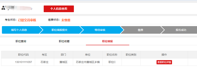 填報(bào)成功后進(jìn)行報(bào)考誠(chéng)信承諾書的認(rèn)真閱讀并進(jìn)行報(bào)考職位的核對(duì),確定報(bào)名信息后進(jìn)入等待審核狀態(tài),如審核不通過則需根據(jù)招考單位寫出的審核理由返回修改完善個(gè)人信息或更改報(bào)考職位。