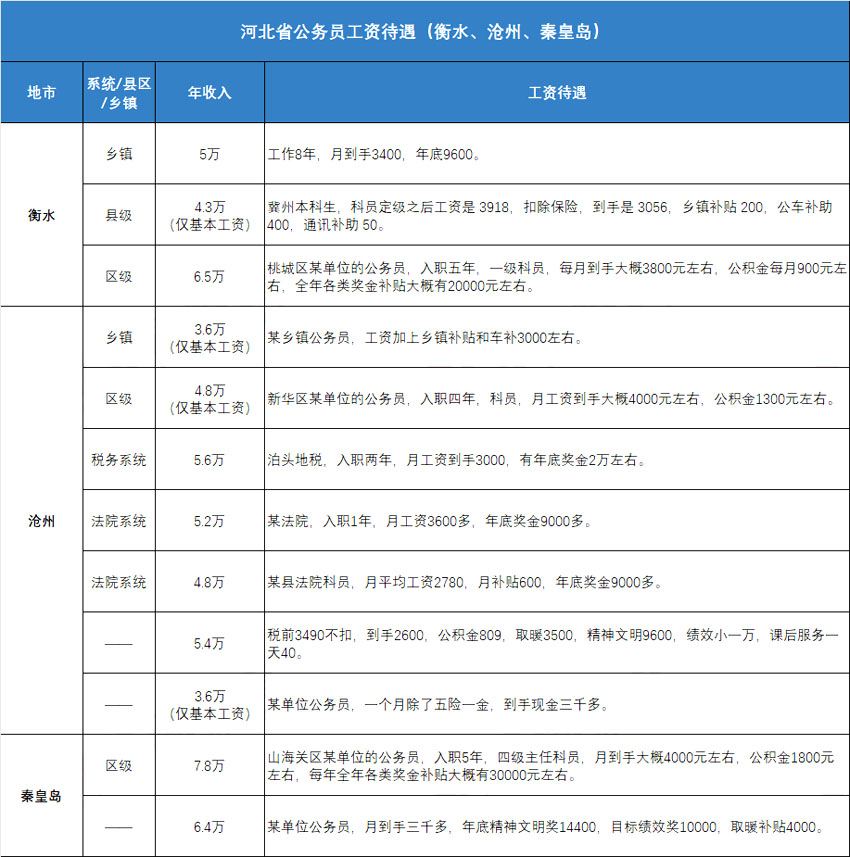 滄州:鄉(xiāng)鎮(zhèn)約3.6萬(wàn)(僅基本工資);稅務(wù)系統(tǒng)約5.6萬(wàn);法院系統(tǒng)約5萬(wàn)