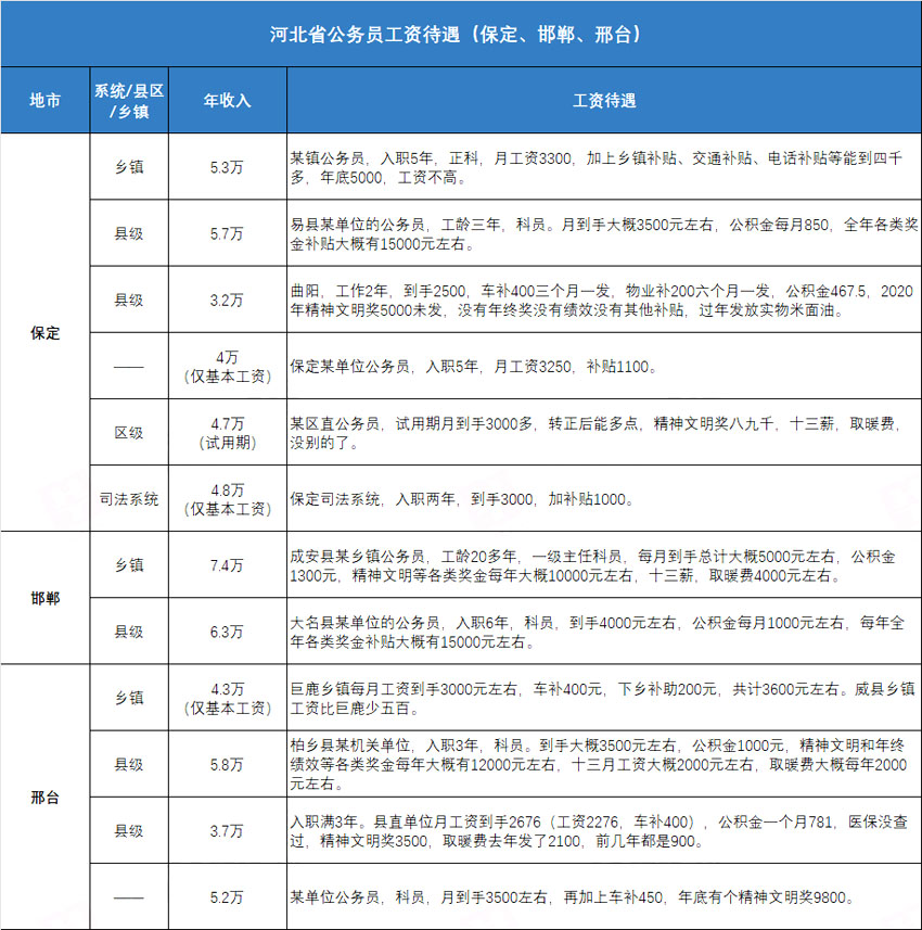 保定:縣級(jí)約3萬(wàn)~5.3萬(wàn);司法系統(tǒng)約4.8萬(wàn)(僅基本工資)