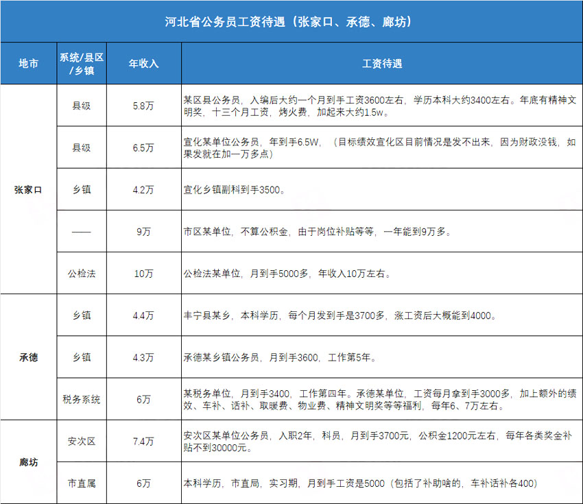 張家口:鄉(xiāng)鎮(zhèn)約4.2萬(wàn);縣級(jí)約5.8萬(wàn);公檢法約10萬(wàn)
