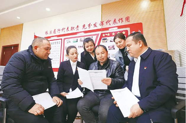 近年來,新疆維吾爾自治區(qū)人大加強(qiáng)地方立法,為新疆社會穩(wěn)定和長治久安提供法律保障。圖為2022年2月17日,自治區(qū)人大代表與喀什疏附縣縣鄉(xiāng)兩級人大代表在疏附縣人大代表工作室共同學(xué)習(xí)《新疆維吾爾自治區(qū)民族團(tuán)結(jié)進(jìn)步模范區(qū)創(chuàng)建條例》。新疆維吾爾自治區(qū)人大常委會供圖