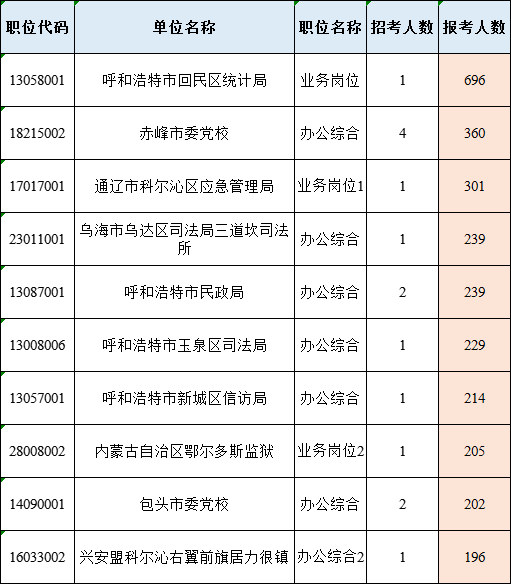以下為報(bào)考人數(shù)最多的前十崗位