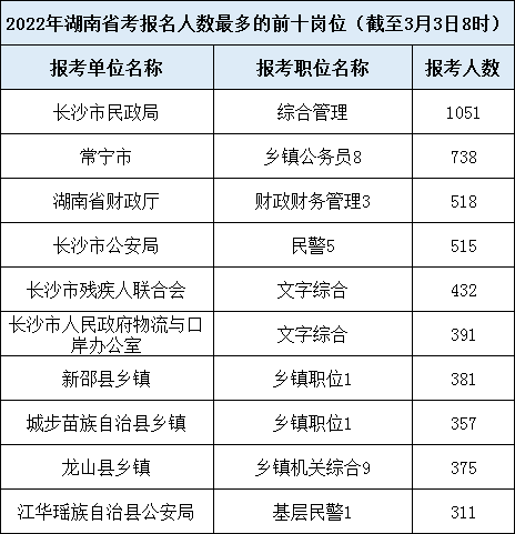截至3月3日8時(shí),2022年湖南公務(wù)員考試已有81269人報(bào)名,271個(gè)崗位無人報(bào)考,具體數(shù)據(jù)見附件: