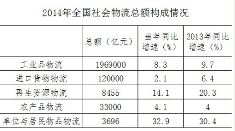 2014年全國社會物流總費(fèi)用10.6萬億元,同比增長6.9%,其中,運(yùn)輸費(fèi)用5.6萬億元,同比增長6.6%;保管費(fèi)用3.7萬億元,同比增長7.0%;管理費(fèi)用1.3萬億元,同比增長7.9%。