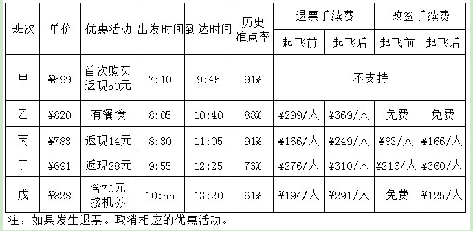 131.5月30日早晨,王先生由于記錯了時間,10︰30到達(dá)機(jī)場時,所購班次的飛機(jī)已經(jīng)起飛,幸運(yùn)的是隔天同一班次的機(jī)票還有售,且價錢不變,于是在窗口辦理了改簽。加上之前網(wǎng)上訂票的費(fèi)用,王先生一共花費(fèi)了900多元,他所購買的最可能是哪個班次的機(jī)票( )。