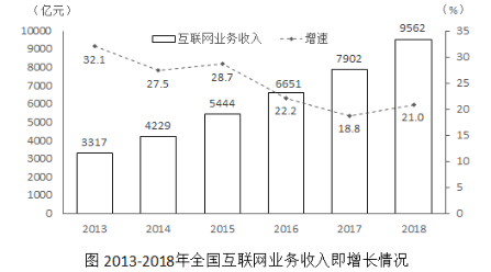 2018年全國互聯(lián)網(wǎng)業(yè)務(wù)收入9562億元,比上年增長21.0%。其中,廣東、上海、北京互聯(lián)網(wǎng)業(yè)務(wù)收入分別增長26.5%、20.0%和25.2%。2018年互聯(lián)網(wǎng)企業(yè)信息服務(wù)收入8594億元,比上年增長20.7%。其中,電子商務(wù)平臺收入3667億元,增長13.1%;網(wǎng)絡(luò)游戲業(yè)務(wù)收入1948億元,增長17.8%。2018年互聯(lián)網(wǎng)行業(yè)研發(fā)投入490億元,比上年增長19.0%。