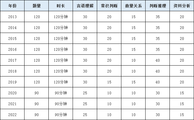 2013-2022年山東公務(wù)員考試行測題型題量、時長統(tǒng)計