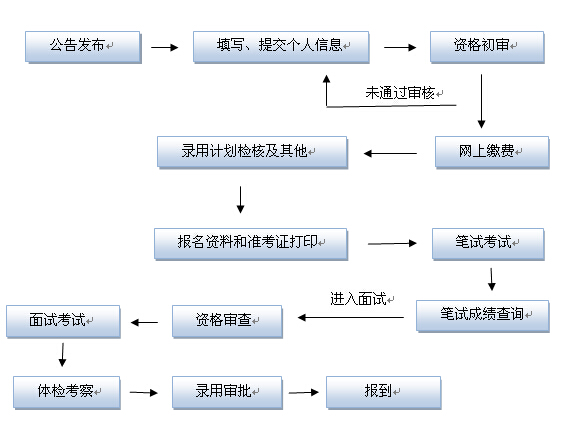 山東公務(wù)員考試近幾年來采用的招錄流程是固定的,大致如下:發(fā)布公告→網(wǎng)上報名→提交報考申請→報名資格網(wǎng)上初審→查詢并再次報名→網(wǎng)上繳費→打印準考證→筆試→查詢成績→面試(面試前資格復(fù)審、面試前公開調(diào)劑、發(fā)布遞補名單、面試、計算成績)→體能測評→體檢和考察→公示和審批。