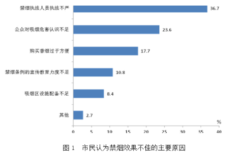 對(duì)“公共場(chǎng)所控?zé)煚顩r改善效果”問題的調(diào)查結(jié)果顯示:26.0%的受訪市民表示效果明顯,55.3%的表示效果一般,16.2%的表示沒有效果,2.5%的表示效果很差。當(dāng)對(duì)認(rèn)為控?zé)煛皼]有效果”“效果很差”的受訪市民詢問原因時(shí),19.8%的女性受訪市民認(rèn)為“購買香煙過于方便”,比男性市民高5.0個(gè)百分點(diǎn);40.5%的市民認(rèn)為“禁煙執(zhí)法不嚴(yán)”(其它原因見圖1),其中 40.3%的老年市民選擇“禁煙執(zhí)法不嚴(yán)”,比中年、青年市民分別高出2.9和5.6個(gè)百分點(diǎn)。