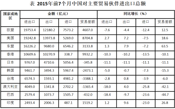 C.2015年前7個(gè)月,中國(guó)對(duì)其出口額超過5000億元的主要貿(mào)易伙伴數(shù)是4