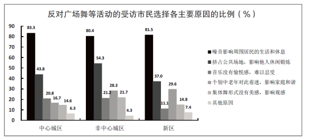 D、在反對廣場舞等活動(dòng)的非中心城區(qū)受訪者中,選擇“音樂沒有愉悅感,難以忍受”的比例高于其他區(qū)域