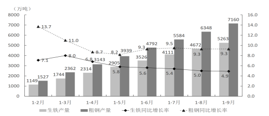 2014年1—9月江蘇生鐵、粗鋼產(chǎn)量及同比增長率