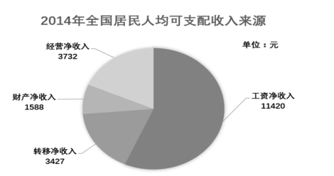 2014年全國居民人均可支配收入20167元,比上年增長10.1%,收入來源如下圖所示。按常住地分,城鎮(zhèn)居民人均可支配收入28844元,比上年增長9.0%;城鎮(zhèn)居民按戶人均可支配收入的中位數(shù)為26635元,增長10.3%。農(nóng)村居民按戶人均可支配收入10489元,比上年增長11.2%,農(nóng)村居民人均可支配收入的中位數(shù)為9497元,增長12.7%。全國居民人均消費(fèi)支出14491元,比上年增長9.6%。按常住地分,城鎮(zhèn)居民人均消費(fèi)支出19968元,增長8.0%;農(nóng)村居民人均消費(fèi)支出8383元,增長12.0%。