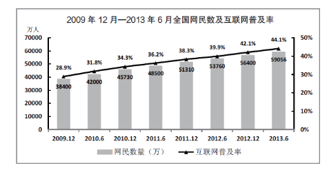 (2)2013年6月,全國互聯(lián)網普及率比2010年6月提高了12.3個百分點