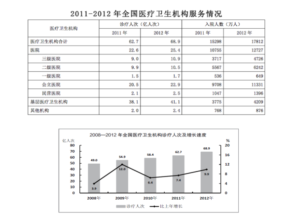 (1)2010-2012年三年,全國醫(yī)療衛(wèi)生機構年平均診療人次為63.3萬;